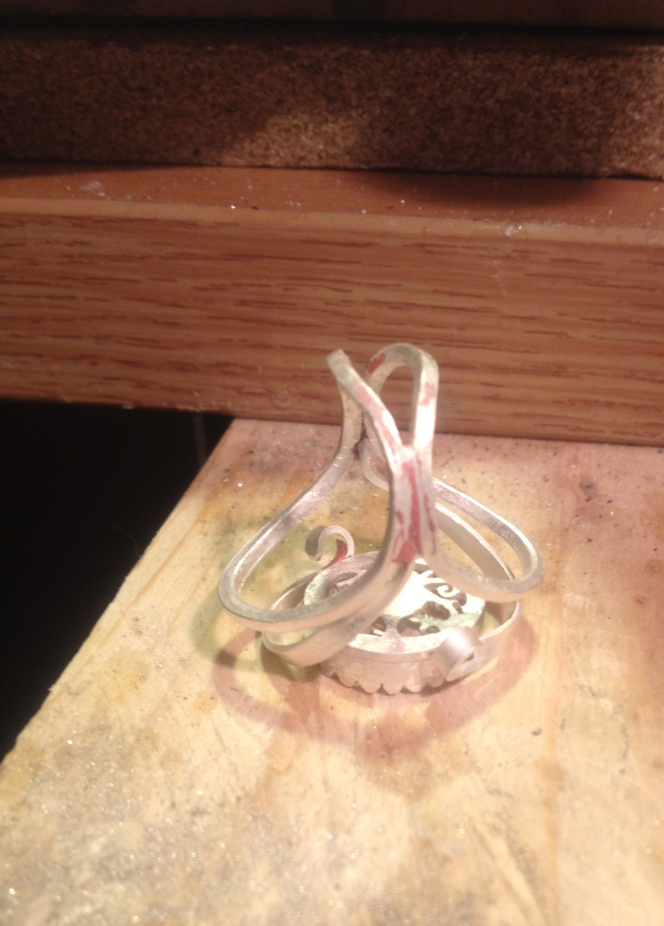 Из толстой серебряной квадратной проволоки спаяла основу кольца. Развожу края, периодически прикладывая кабошон и представляя, как это все когда-нибудь будет чудесно смотреться... Параллельно делаю каст, к круглому донышку припаяла борта и переворачиваю, чтобы разметить рисунок.